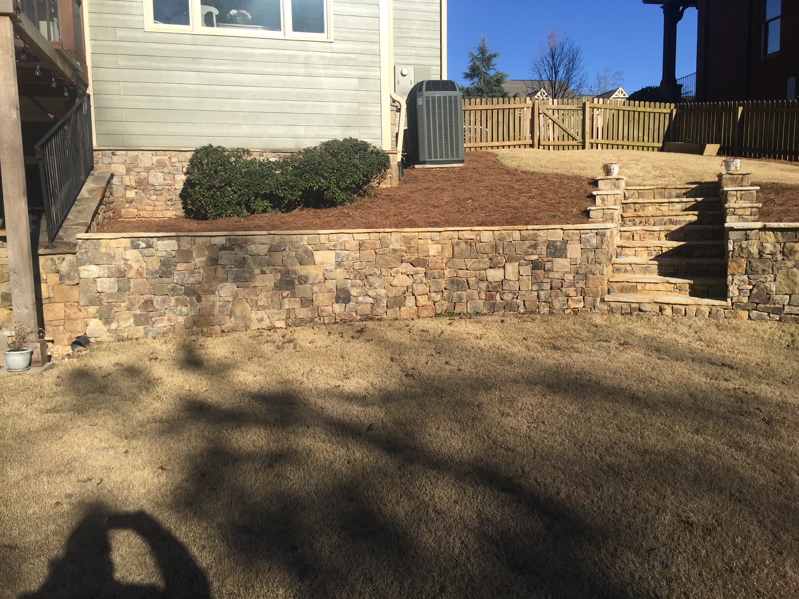 Transformed a steeply sloped backyard with tiered retaining walls, stone steps, and a level patio area at the bottom. Added drainage to protect the home's foundation.