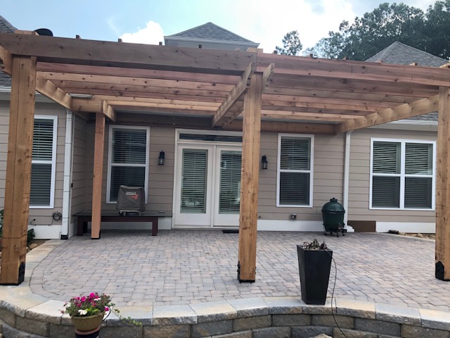 Built a cedar pergola over an existing patio and added landscape beds, a bubbling boulder fountain, and low-voltage lighting to create a complete outdoor room.
